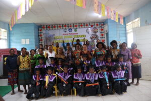 Foto bersama para guru Yegeka, Pengurus Yayasan, Kepala Bidang TK PAUD dan Pendidikan Non Formal Dinas Pendidikan Paniai, Bunda Pokja, Operator Sekolah, dan Anak-anak yang Dilepas pada sesi foto bersama....